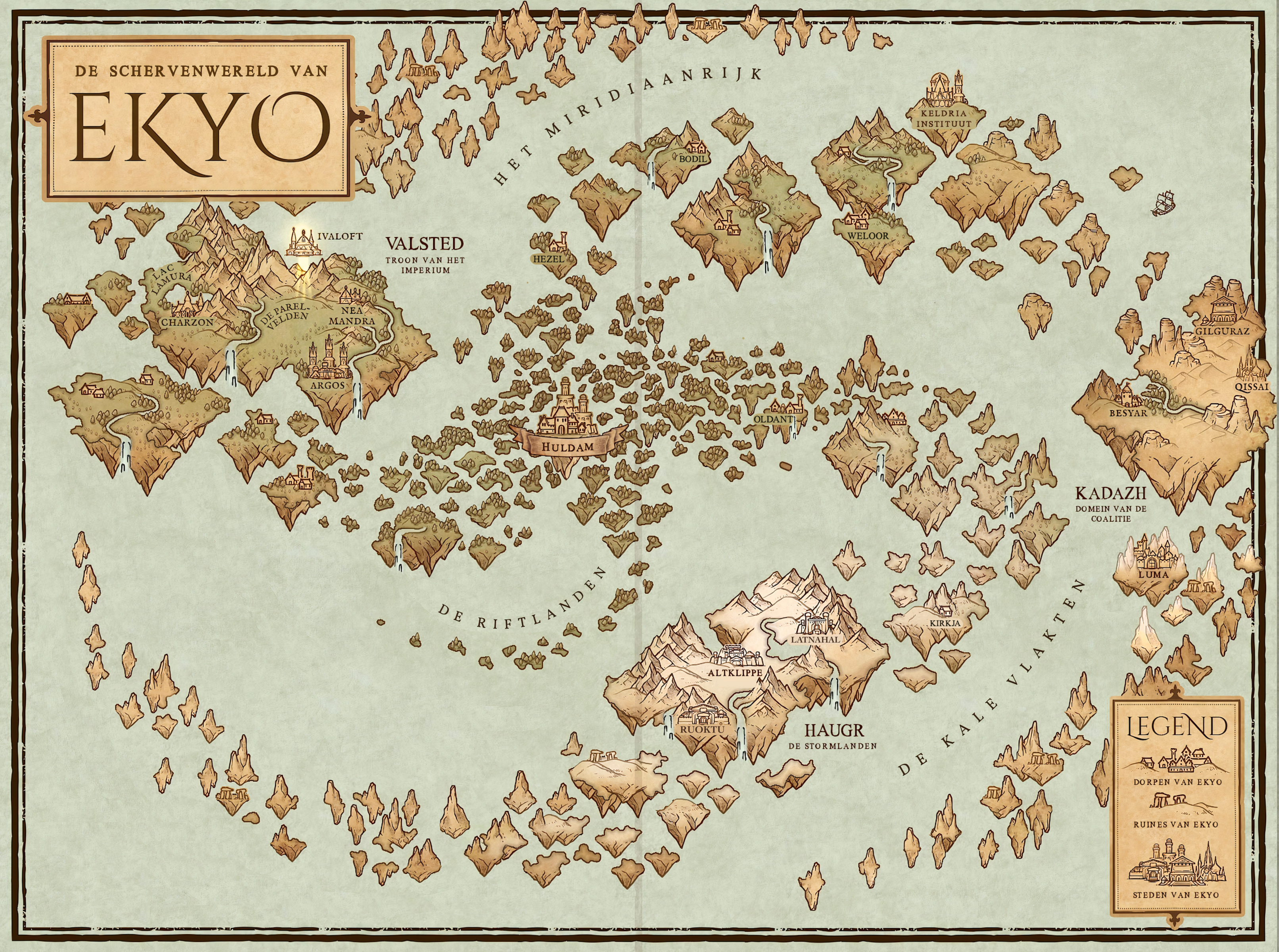 Ekyo is een wereld van oneindige mogelijkheden en schitterende chaos. Het is ook, vrij letterlijk, een gebroken wereld. Het bestaat namelijk uit een ontelbaar aantal zwevende eilanden. Daaronder, waar je ook kijkt, het eindeloze Wolkendek. De eilanden zijn steeds in beweging. Een onbegrijpelijke zwaartekracht houdt alles in de lucht. Is de wereld altijd al zo geweest? Of is hij zo geworden? Dat is een mysterie, zelfs voor de mensen die er wonen.